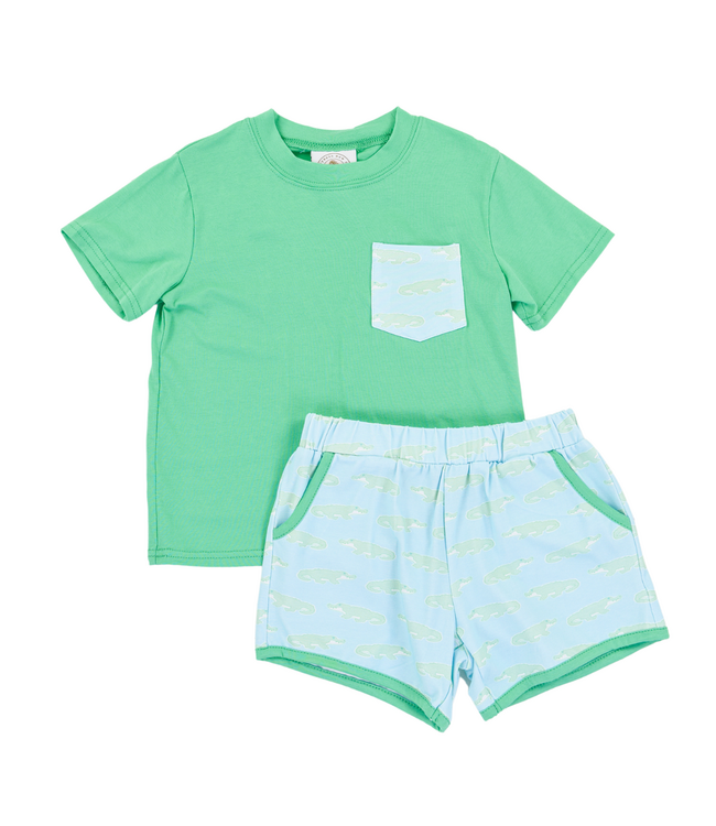Get ready for some gator-great fun with the A Little Snappy Beckham Play Set by Cypress Row! This playful two-piece set features a bright green shirt with a printed pocket, paired with matching shorts in an allover alligator print.