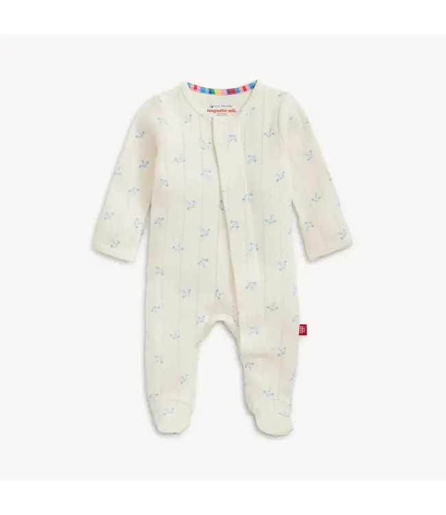 Ready for sweet dreams and cozy cuddles, the Airplane Pointelle Footie by Magnetic Me is as soft as it is adorable. Made from breathable organic pointelle fabric, this footie features a gentle ivory background sprinkled with tiny blue airplanes for a charming, sky-high touch.