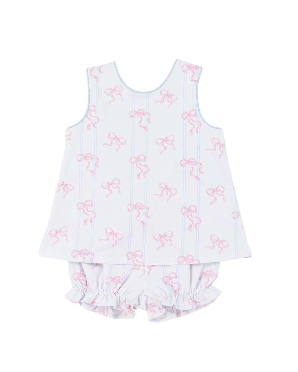 Totally bow-tiful! The Bowtiful Cassidy Crossover Set by Cypress Row features pink bows on a blue stripe print with a crossover-back top.