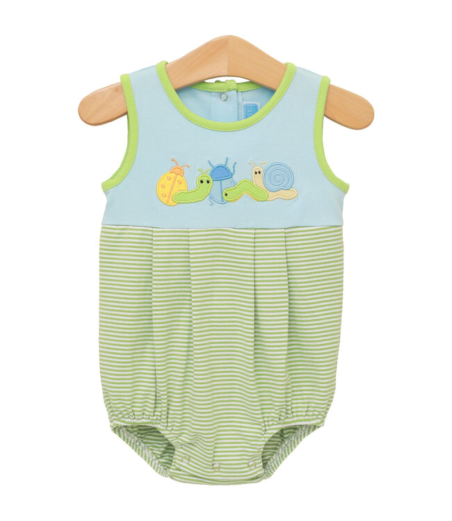 The Bugging Around Bubble is a sweet all-in-one outfit made for little explorers. This adorable bubble features a light blue top portion with cute bug appliqués, seamlessly flowing into a green striped bottom for a coordinated look in one easy piece. Comfortable and charming, it’s perfect for warm days, everyday wear, and sibling matching with the older boys’ short set.