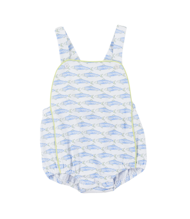 Reel in the cuteness with the Catch and Release Silas Sunsuit by Cypress Row! This adorable sunsuit features playful schools of blue and green fish swimming across a soft, coastal-inspired print. Finished with light green trim, it adds a fresh pop of color to the sweet design.
