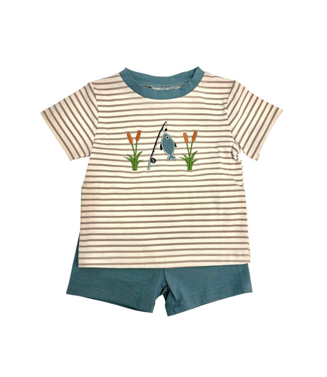 Reel in some classic style with the Catch of the Day Short Set by Three Sisters. This charming two-piece set features a tan striped shirt finished with blue trim and an adorable appliquéd blue fish on a fishing line hook front and center. Paired with solid blue shorts that perfectly match the trim, this set blends playful detail with timeless design.