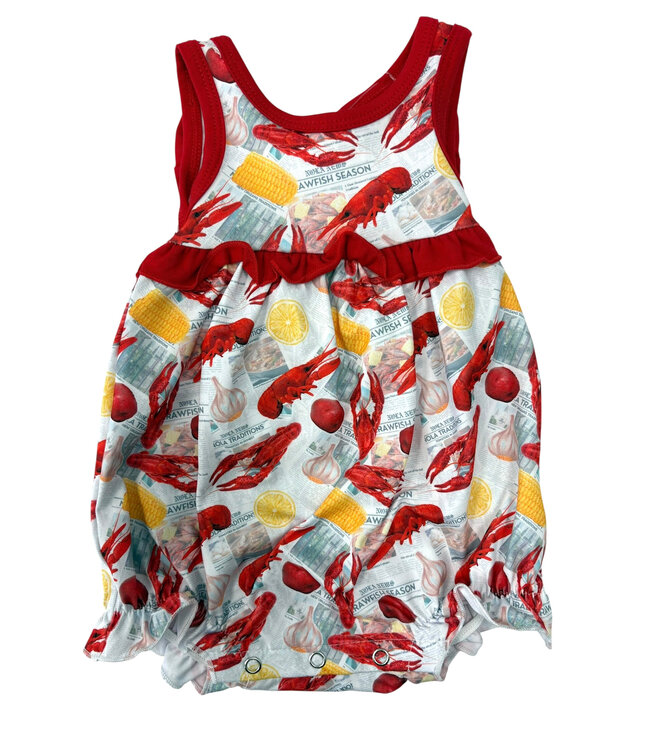 Sweet Southern style meets statement charm in the Crawfish Newspaper Print Bubble. This adorable crawfish print baby girl bubble features a playful newspaper-inspired pattern filled with crawfish, corn, potatoes, and classic boil fixings for a fun novelty look. The standout detail is the large red bow on the back, adding eye-catching flair and boutique appeal. Lightweight and comfortable, this Louisiana-themed baby girl outfit combines classic style with playful personality for a unique addition to her wardrobe.
