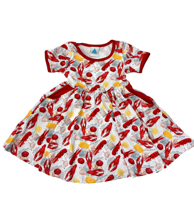 Fresh off the press and full of Southern charm, the Crawfish Newspaper Print Dress features a playful newspaper-style print covered in crawfish, corn, potatoes, and classic boil fixings. This eye-catching crawfish print dress for girls blends fun novelty style with a timeless silhouette, making it a standout Louisiana-themed girls dress and unique seafood boil print outfit.