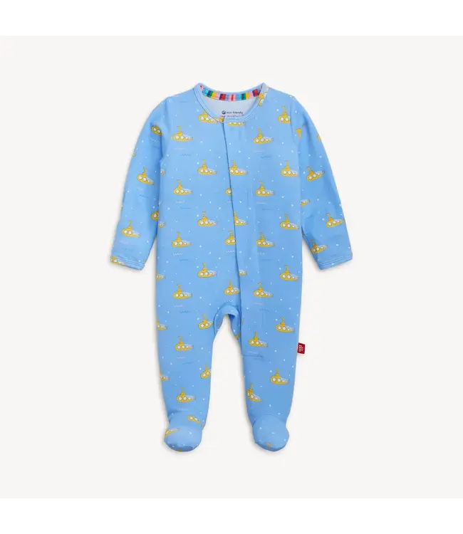 Sub-marine your worries—this one’s adorable! The Dip Ship Modal Footie by Magnetic Me is a splash of playful charm for little ones. This fun submarine print baby footie features a bold bright blue background dotted with cheerful yellow submarines for an under-the-sea adventure vibe. Made from ultra-soft modal fabric, this baby footie sleeper is gentle on delicate skin and perfect for cozy snuggles. With its colorful design and comfy feel, this ocean-themed baby outfit is shore to be a favorite.