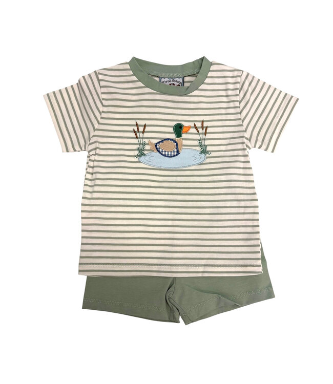 A feathered favorite for little outdoor lovers, the Duck Appliqué Short Set by Three Sisters blends classic style with playful charm. This two-piece set features a green striped shirt with an adorable mallard duck appliqué swimming in a pond, finished with green trim for a polished touch. Paired with solid green shorts that coordinate perfectly, this set is comfortable, timeless, and easy to wear.