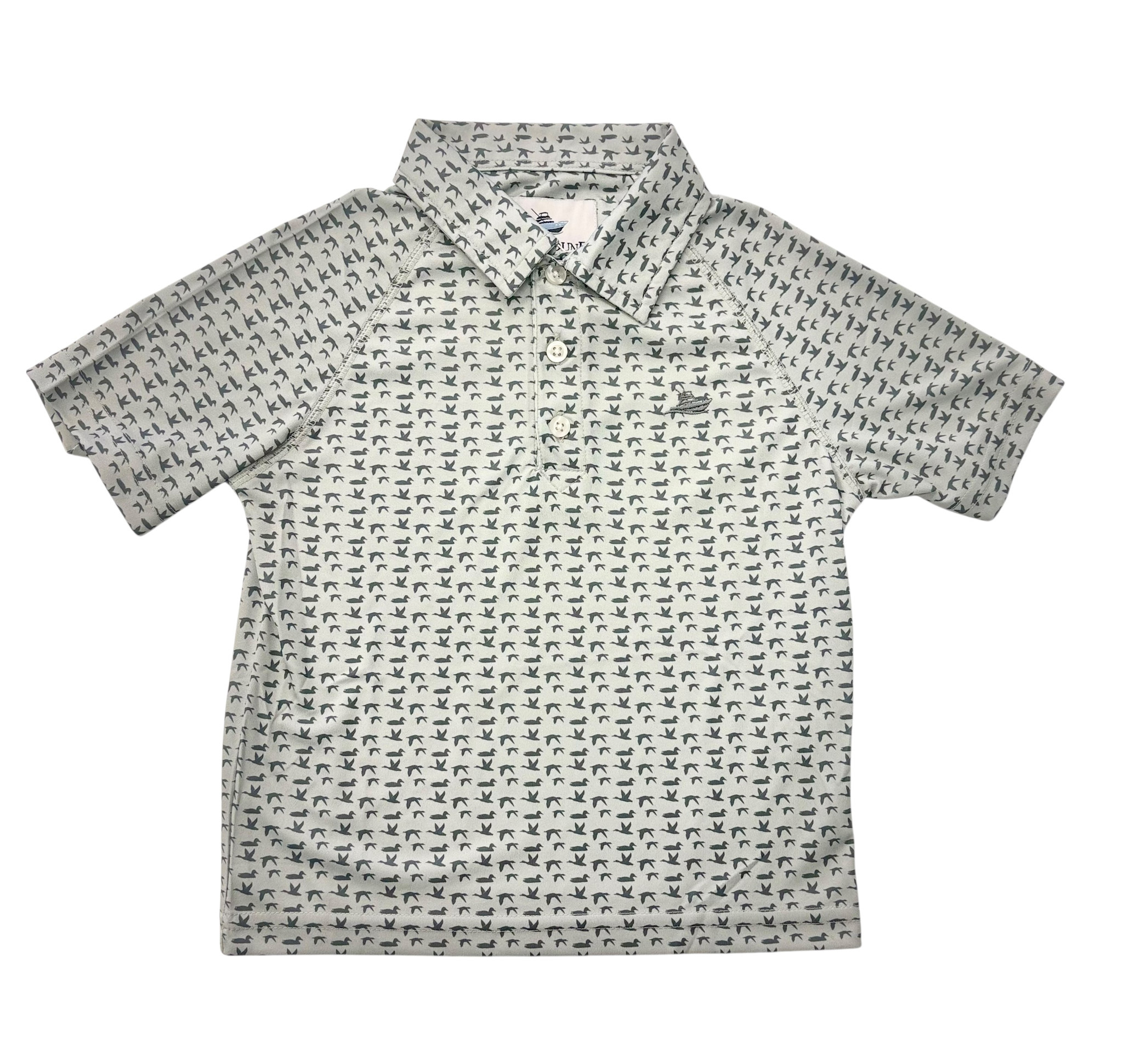 Short sleeve boys polo with an all-over flying duck print.