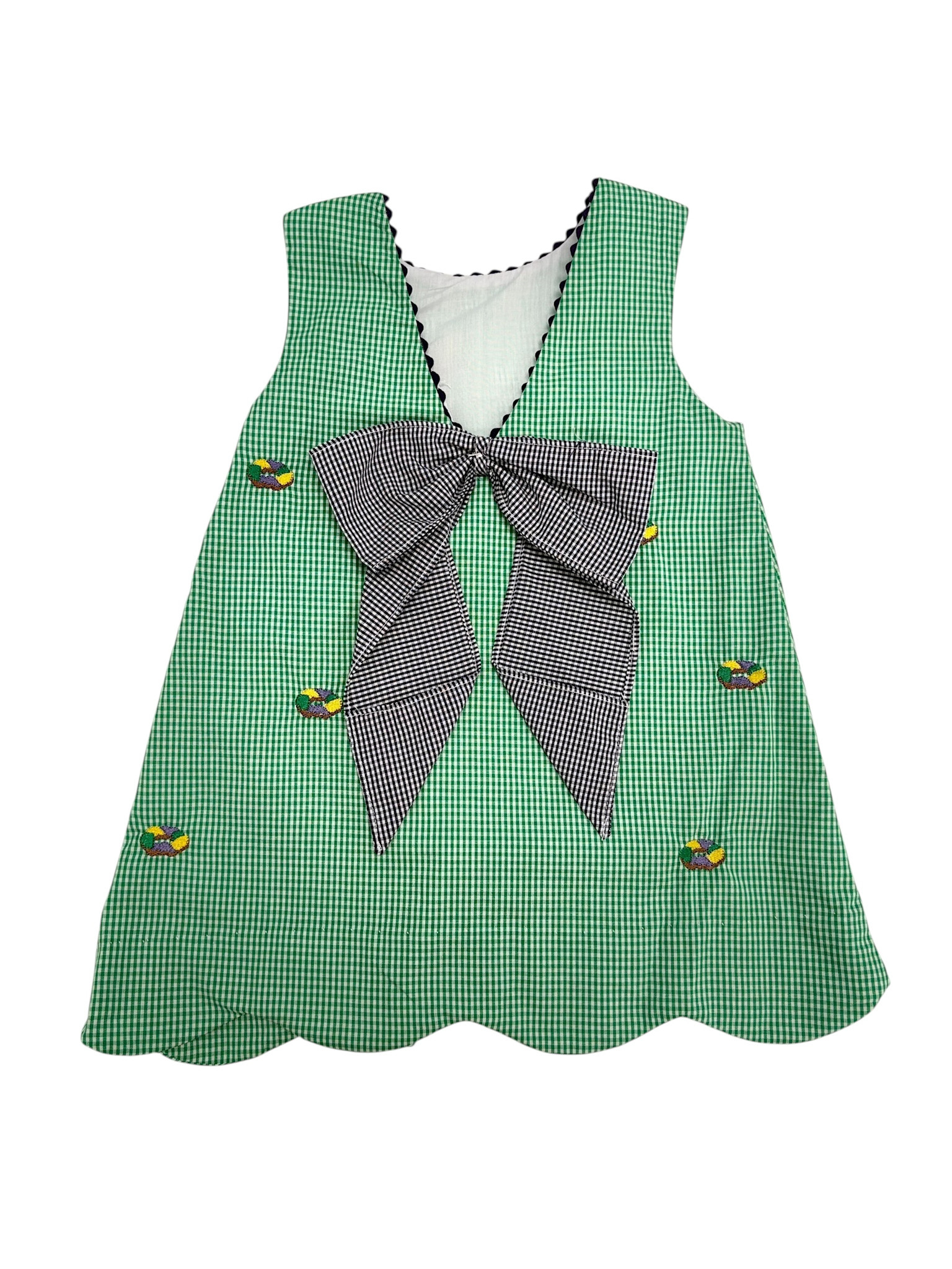 • Green gingham A-line dress with embroidered king cakes and a scalloped hem.