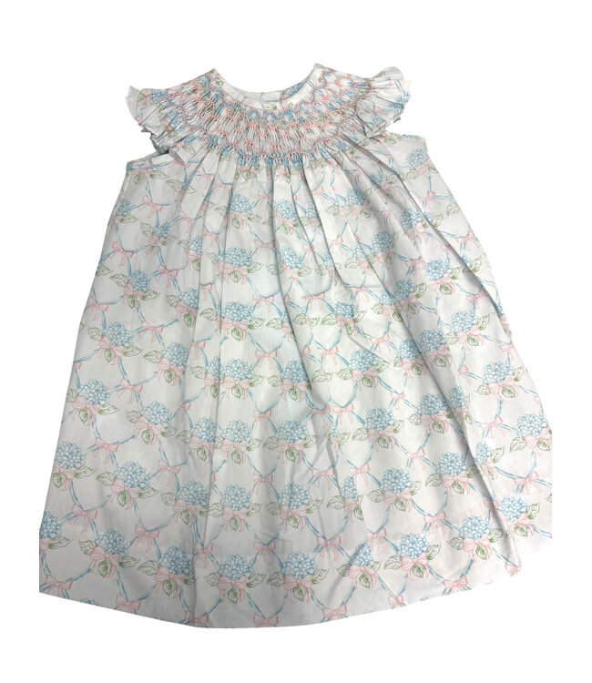 Hydrangea hurry—this one’s blooming adorable! The Endless Summer Smocked Bishop Dress by Banana Split is a timeless favorite for little girls. This beautiful smocked bishop dress features delicate smocking across the neckline and soft angel sleeves for a classic silhouette. The charming print of blue hydrangeas and pink bows adds a fresh floral touch, making this floral girls bishop dress both sweet and eye-catching. With its traditional style and boutique detail, this hydrangea print dress for girls is a garden-party-worthy standout.