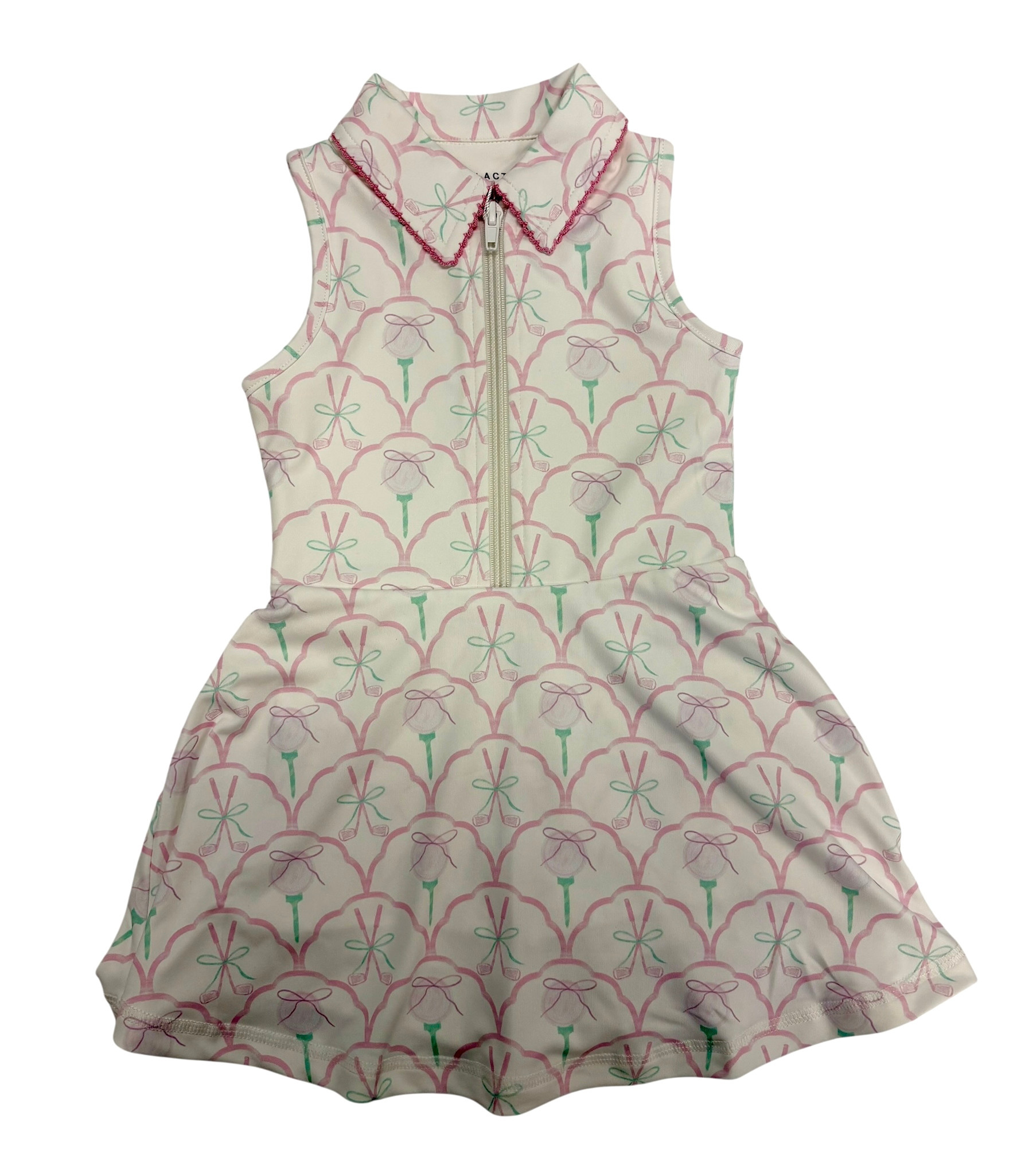 Collared sleeveless girls athletic dress with zipper, golf ball and bow print. Sporty tennis-style outfit.