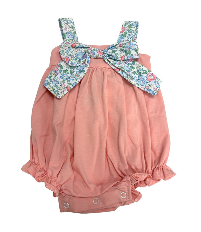 Blooming with sweetness, the Garden Delight Bow Bubble by Banana Split is a floral favorite for little ones. This darling baby girl bubble outfit features a soft pinkish coral bubble accented with floral printed straps for a cheerful pop of color. Front and center sits a large matching floral bow, adding a statement detail that’s equal parts playful and precious. With its bright tones and boutique charm, this floral bow baby bubble is a garden-fresh standout for tiny trendsetters.