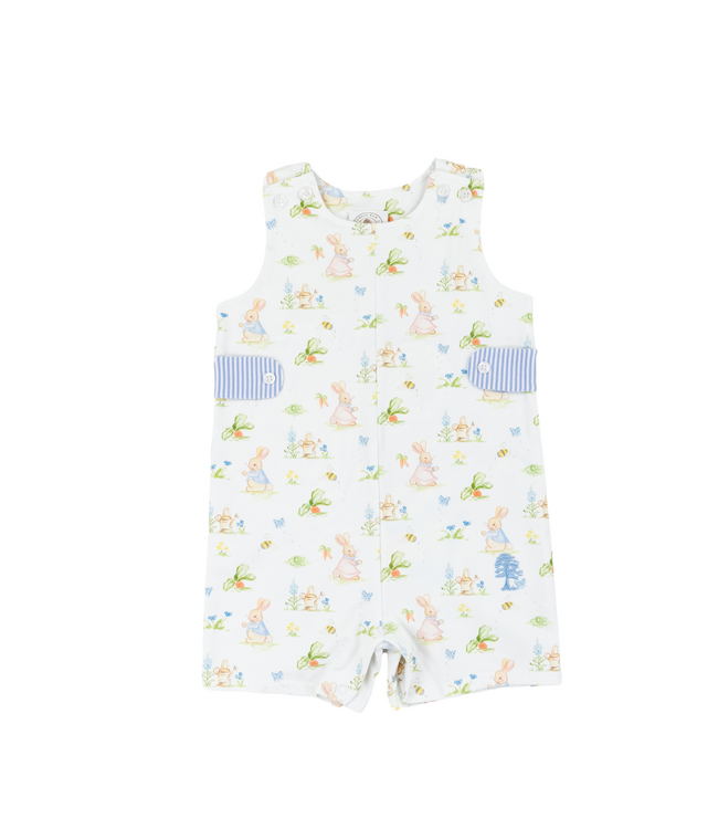Sweet and storybook-charming, the Hops Garden Jonah JonJon by Cypress Row is a timeless favorite for little ones. This darling jonjon features an allover print of whimsical bunnies in a garden setting, giving it a soft, classic feel reminiscent of beloved storybook illustrations. Finished with decorative blue striped side tabs, it adds a polished touch to the playful design.