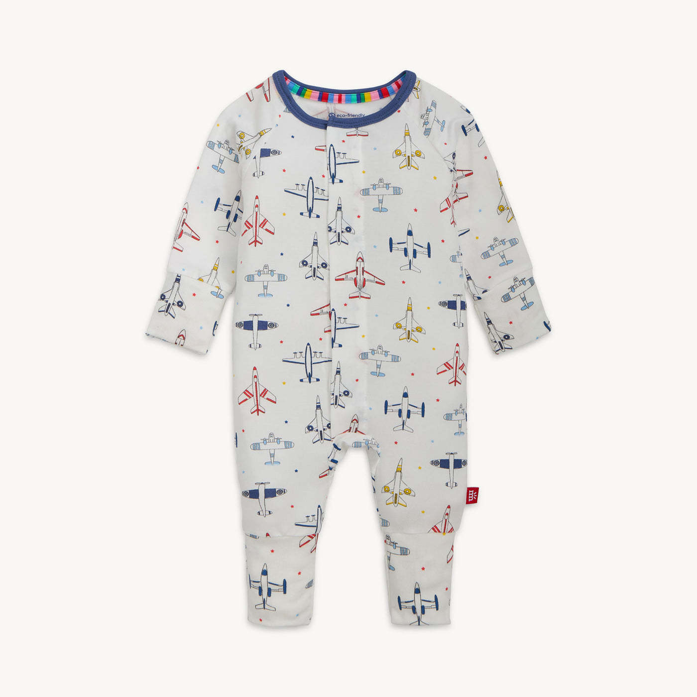 • Soft modal coverall with airplane print and easy magnetic closures.