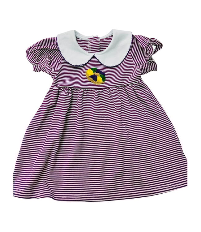 Sweeten her Mardi Gras look with this charming King Cake Dress! Featuring a festive king cake appliqué, classic striped purple fabric, and an adorable Peter Pan collar, this playful boutique dress is made from soft, comfortable fabric perfect for celebrating all day long.