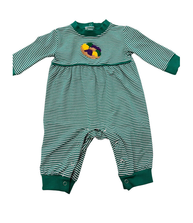 Dress your little one in festive comfort with this adorable King Cake Long Romper for boys. Featuring a cheerful king cake appliqué on the front and classic green striped fabric, this long sleeve romper is perfect for celebrating Mardi Gras in style. Made from soft, cozy material, it keeps babies comfortable while allowing plenty of room to move, crawl, and play.