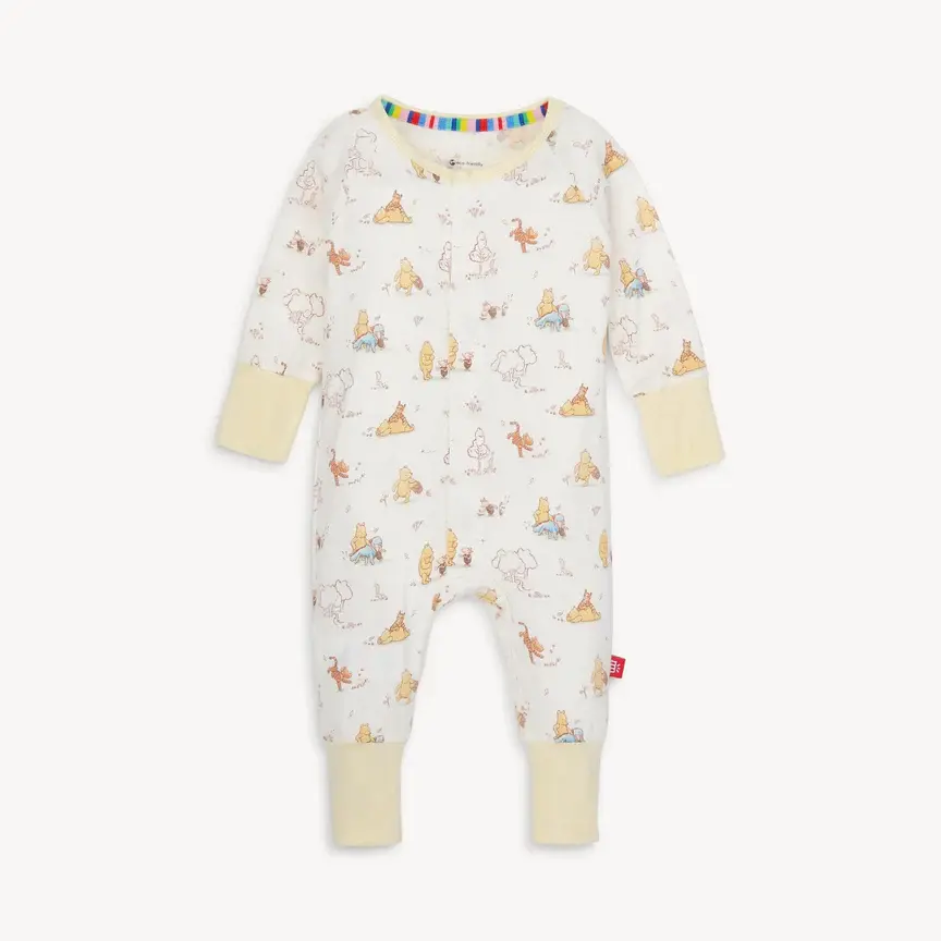 • Gender-neutral Magnetic Me coverall with Pooh and friends in soft pale yellow tones.