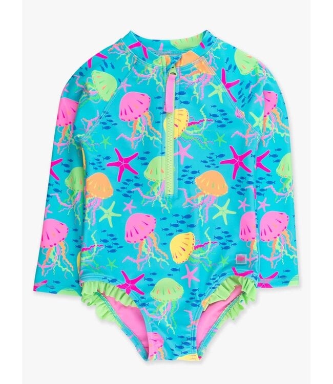 Make a splash in the Neon Jelly Time One-Piece Rash Guard Swimsuit made just for bigger kids! Covered in bright neon jellyfish, this eye-catching swimsuit is designed to help parents easily spot kids while they swim, play, and splash. Featuring a full-coverage rash guard style and an easy front zipper, it’s perfect for pool days, beach trips, and sunny adventures. Fun, bold, and practical, this vibrant suit brings playful boutique style to summer swim days.