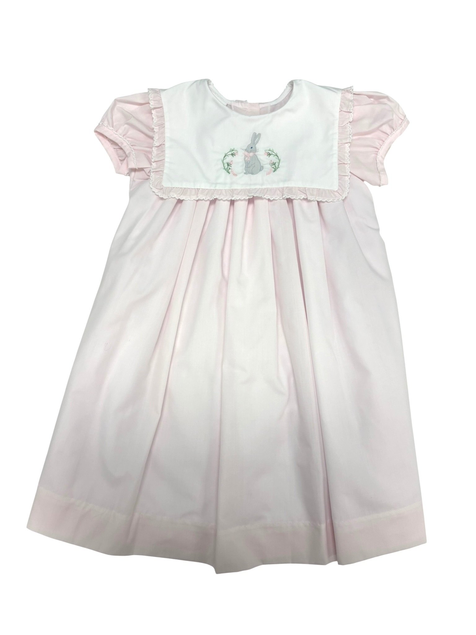 Sweet and timeless, the Oliver Rabbit Dress by Bailey Boys features a light pink design with a white ruffled bib showcasing a bunny, pink bow, and floral details.