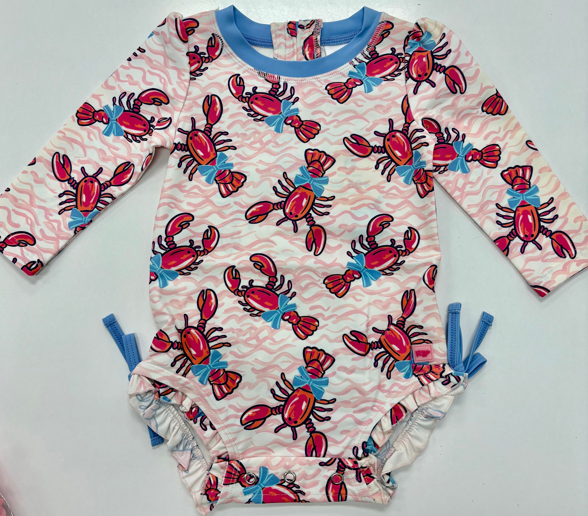 Pink lobster (crawfish) print rashguard swimsuit with RuffleButts’ signature back ruffle.