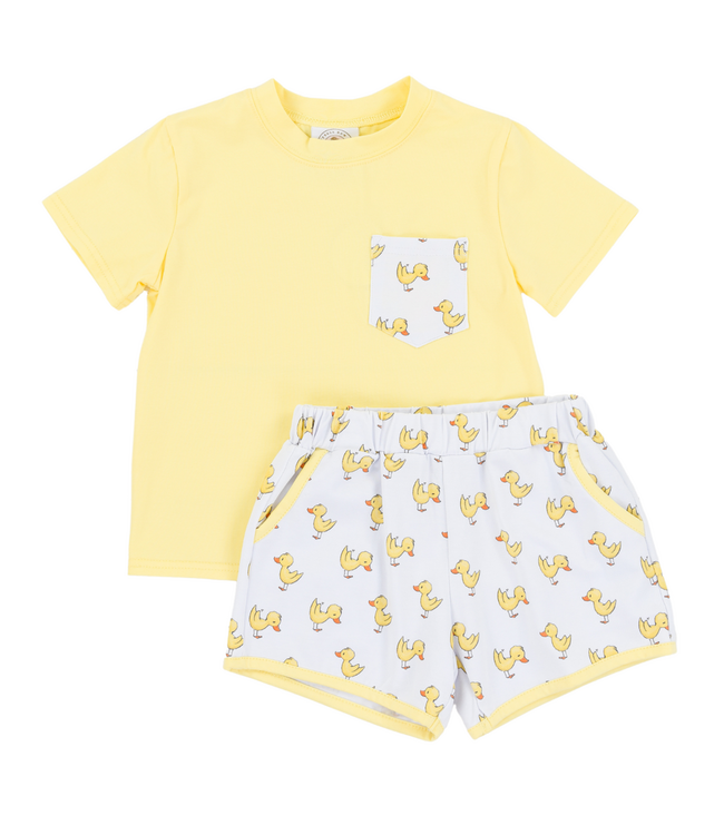 Bright, cheerful, and perfect for play, the Puddle Jumpers Beckham Play Set by Cypress Row is made for fun-filled days. This adorable two-piece set features a bright yellow shirt with a patterned pocket, showcasing the cutest yellow duck print. Paired with matching shorts in the same duck pattern, it creates a coordinated look that’s playful and comfortable.