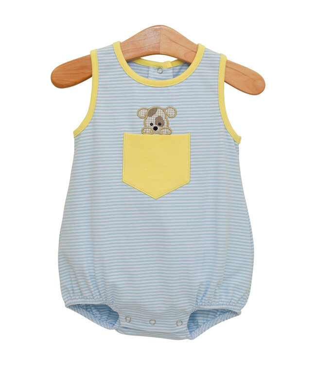This one is paw-sitively adorable! The Puppy Paws Bubble features a classic blue and white striped bubble topped with a cheerful yellow chest pocket. Peeking out of the pocket is the sweetest surprise—a cute puppy appliqué popping his head and paws out, ready for cuddles and compliments.