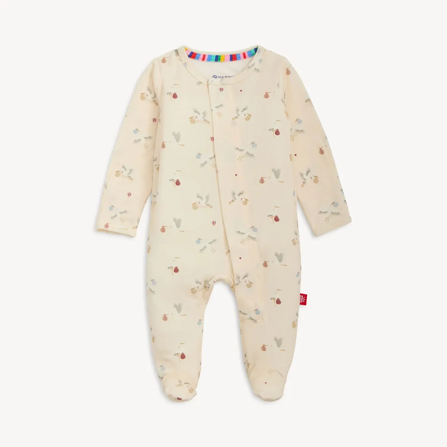 Ivory baby footie with stork print in soft modal fabric. Gender-neutral sleeper for babies.