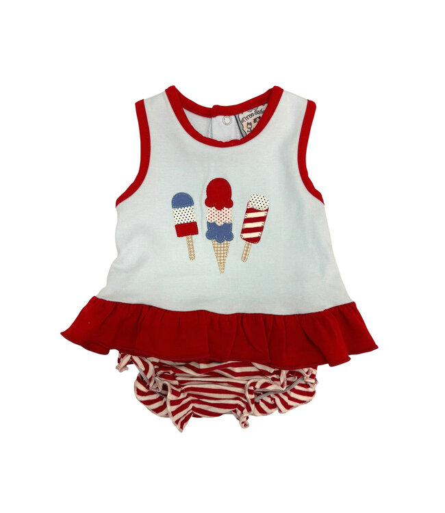This outfit is a summer sweetheart! The Summer Treats Girls Bloomer Set by Three Sisters features a light blue top adorned with appliquéd red, white, and blue ice cream cones and popsicles for a fun, patriotic touch. Finished with a red ruffle hem, the top adds an extra dose of charm. Paired with red and white striped bloomers, this set is perfectly coordinated, comfy, and picture-ready.
