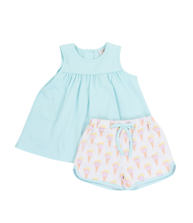Fun, colorful, and made for play, the Sundae Funday Piper Play Set is the perfect warm-weather outfit for little ones on the go. This adorable two-piece set features a solid aqua tank tunic top paired with playful patterned shorts covered in ice cream cones and sprinkles for a sweet, summer-ready look.