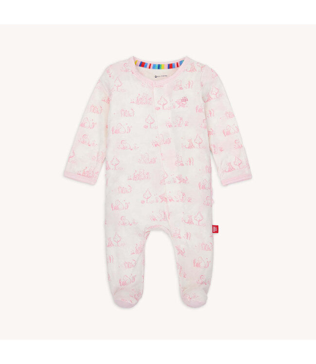 This footie is sweet as can bee! The Sweeter Than Honey Footie features a charming pink toile-inspired print filled with Winnie the Pooh and friends playing together, creating the coziest storybook vibe. Finished with an adorable ruffle butt for extra sweetness, this soft one-piece is perfect for cuddles, naps, and honey-sweet dreams. A precious pick for little girls who are truly sweeter than honey.