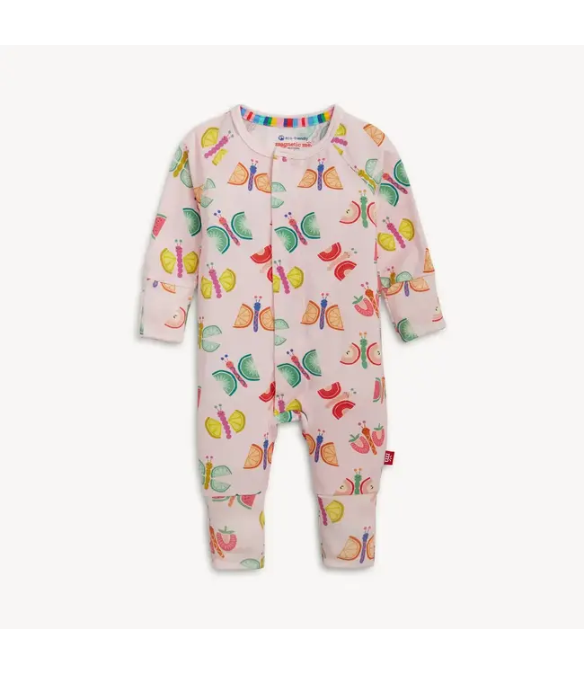 This outfit is simply un-beet-able! The Fruit Flies Magnetic Coverall by Magnetic Me is a whimsical favorite for little ones. This playful baby magnetic coverall features a fun fruit butterfly print, where colorful fruit forms the wings for a sweet and imaginative design in soft pink tones. Designed with convenient magnetic closures, this magnetic baby sleeper makes dressing and changes quick and fuss-free.