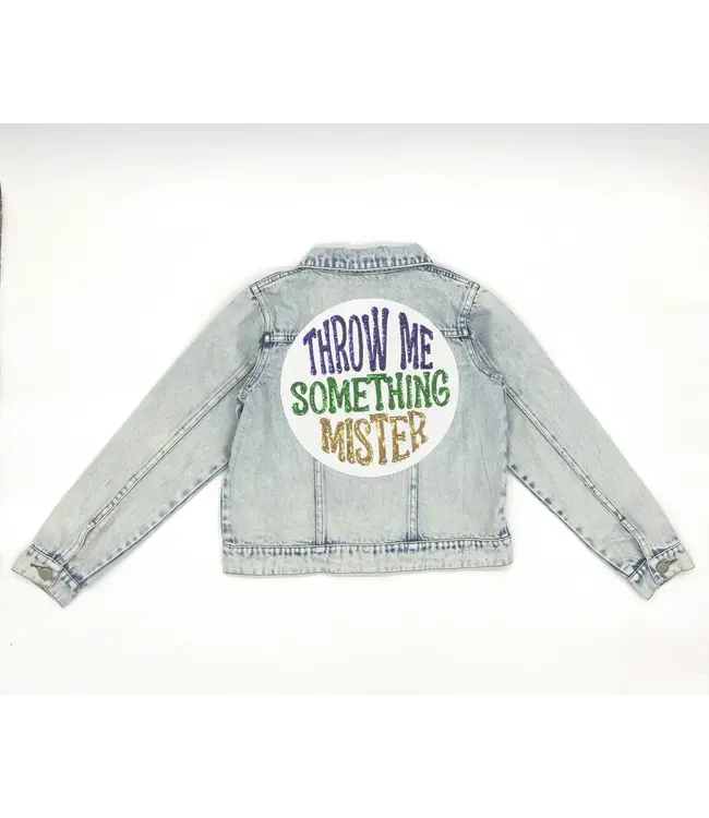Make her Mardi Gras look sparkle with the Throw Me Something Denim Jacket! This classic denim jacket gets a festive upgrade with bold, glittery sequin lettering on the back that reads “Throw Me Something” in vibrant purple, green, and gold. It’s the perfect statement layer for parades, parties, and all the fun Mardi Gras moments.