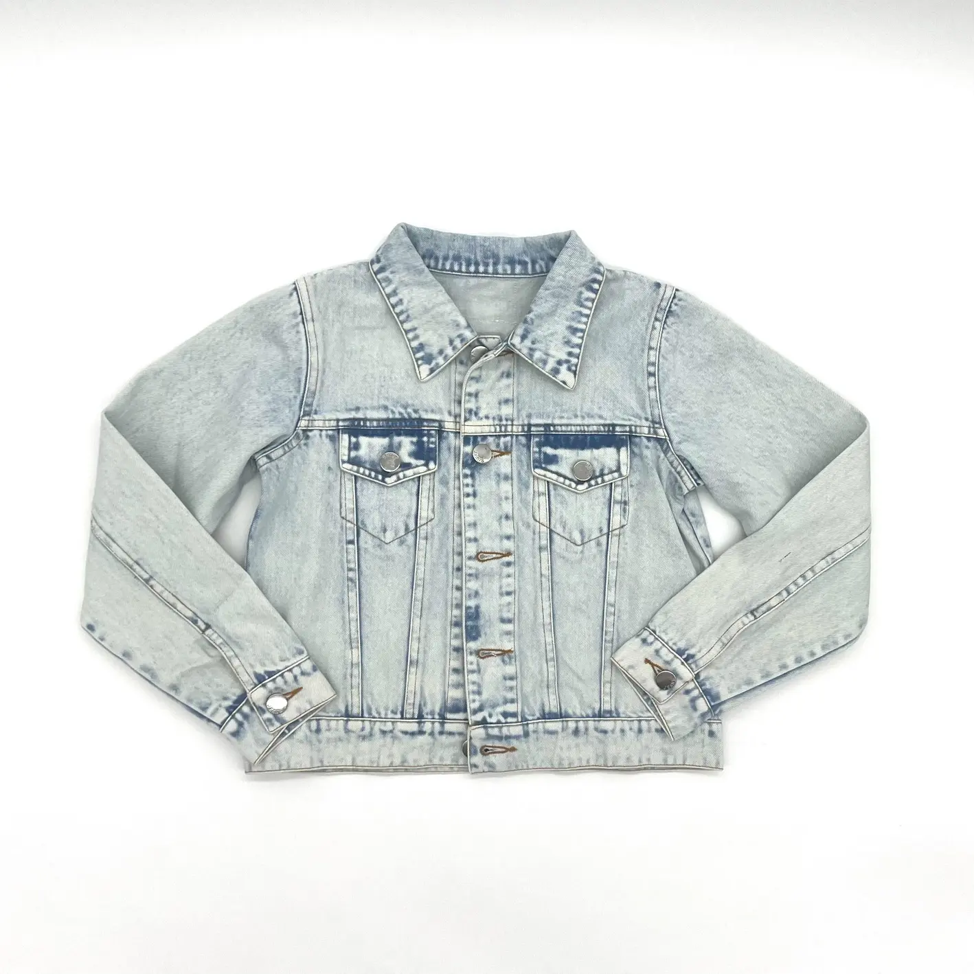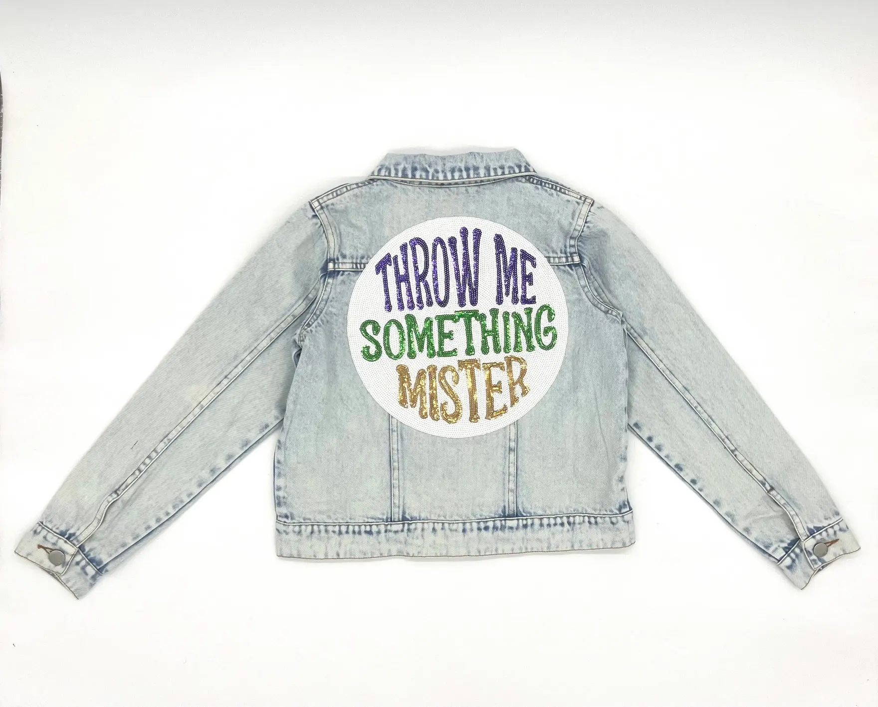 • Classic girls denim jacket featuring glitter sequin “Throw Me Something” lettering in purple, green, and gold on the back.